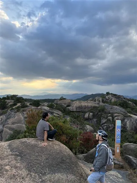 我从山下往上走,只见他一人,落坐一块大岩石上,弓着脚,面对着山川,双手紧抱,默默凝望前方,脸上挂着些许无奈,或者也有一丝惆怅。